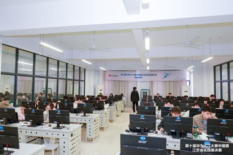第十届华为ICT大赛中国赛江苏省实践赛决赛分为昇腾AI赛道、网络赛道、云赛道、基础软件赛道,近七百名考生参加本次决赛。图为计算中心比赛现场: